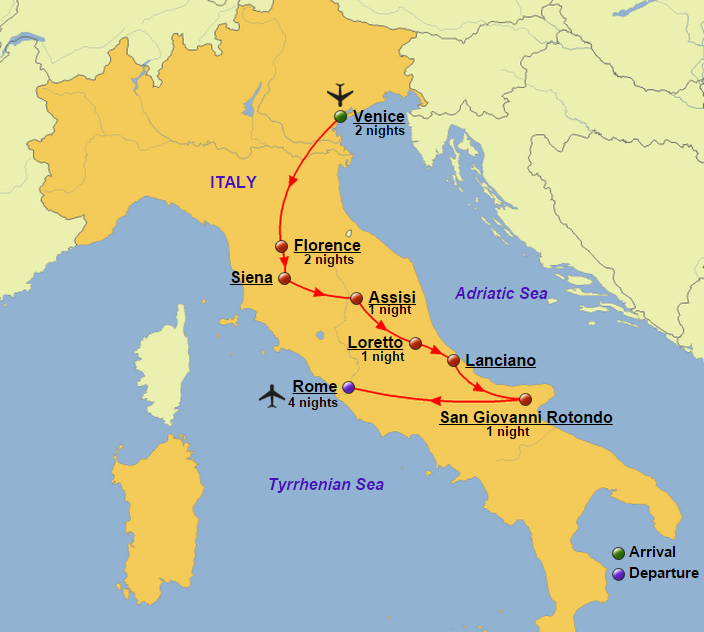 Venice, Florence, Sienna, Assisi, Loretto, Lanciano,