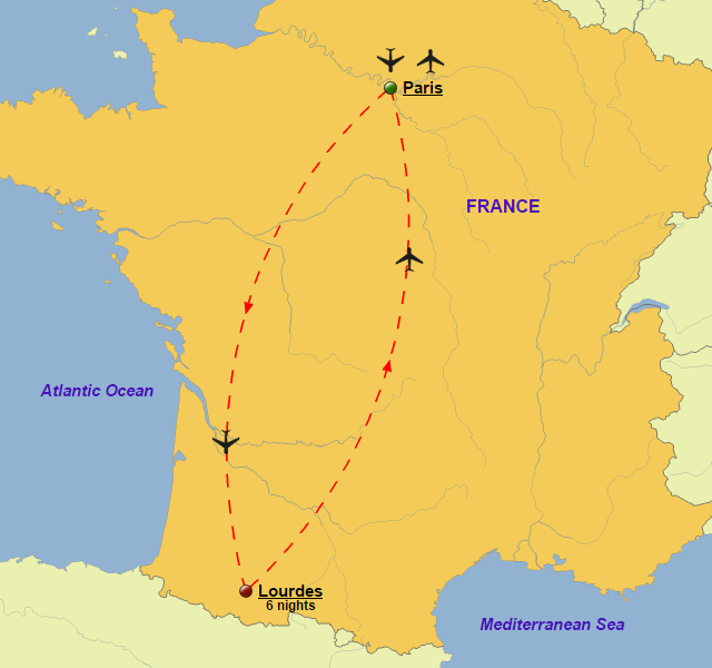 - Round trip transatlantic airfare from JFK, New York to Lourdes
